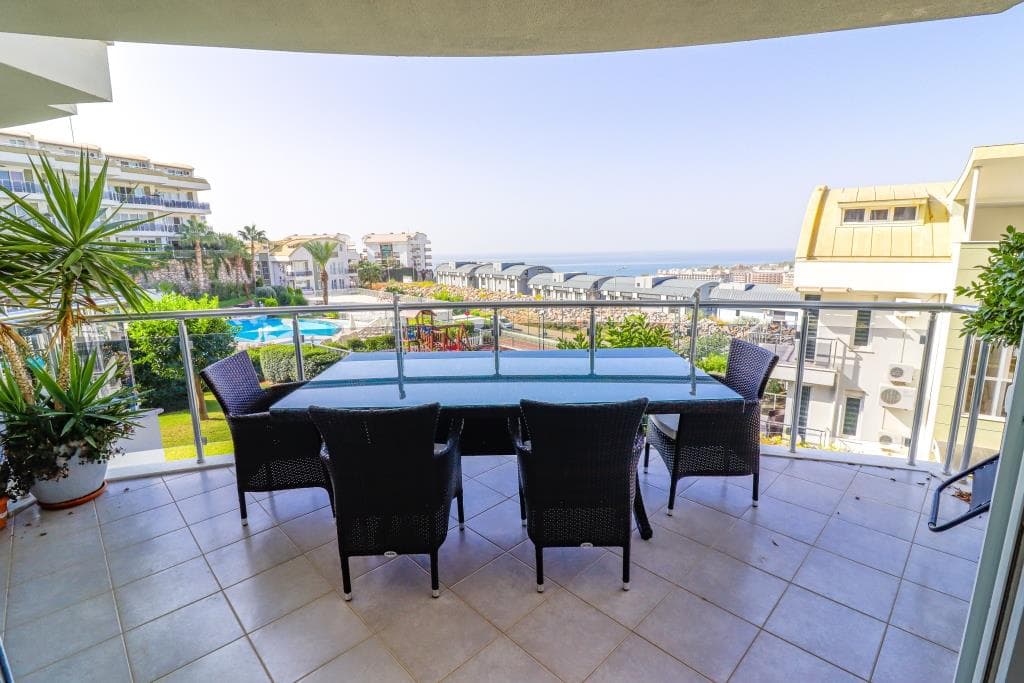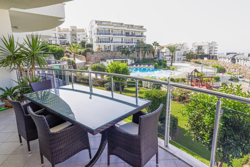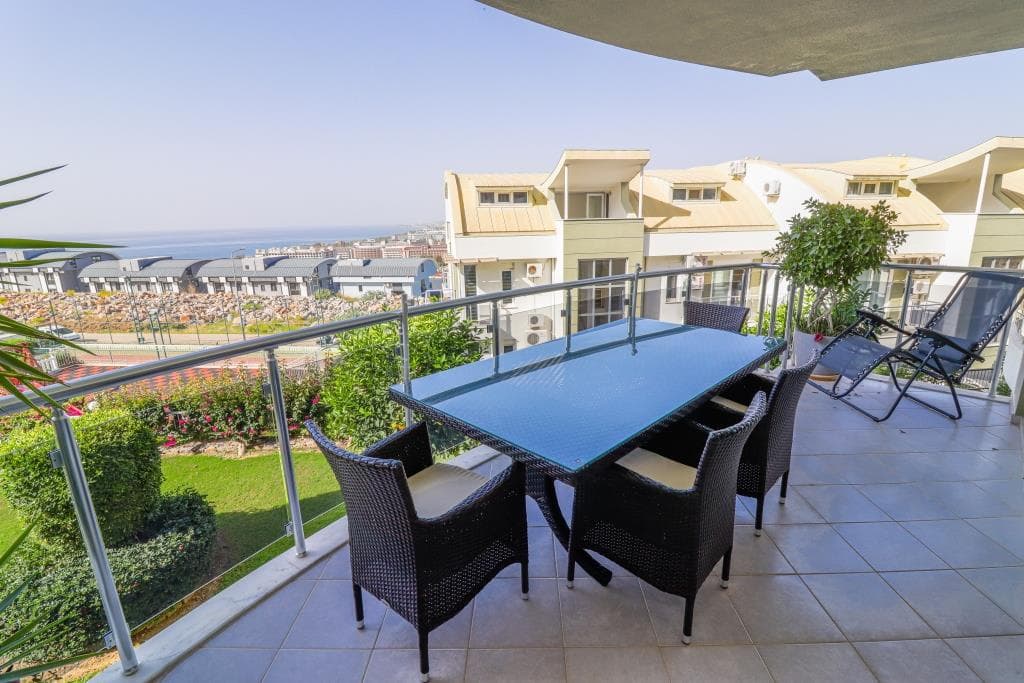 – The apartment is located in a complex with a total of 90 apartments. The common area consists of a nice, well-kept garden and a very large inviting pool with a view of the beach and the Taurus mountains. You will also find training facilities (fitness), sauna and Hamam (Turkish bath) in the common area of the complex.
